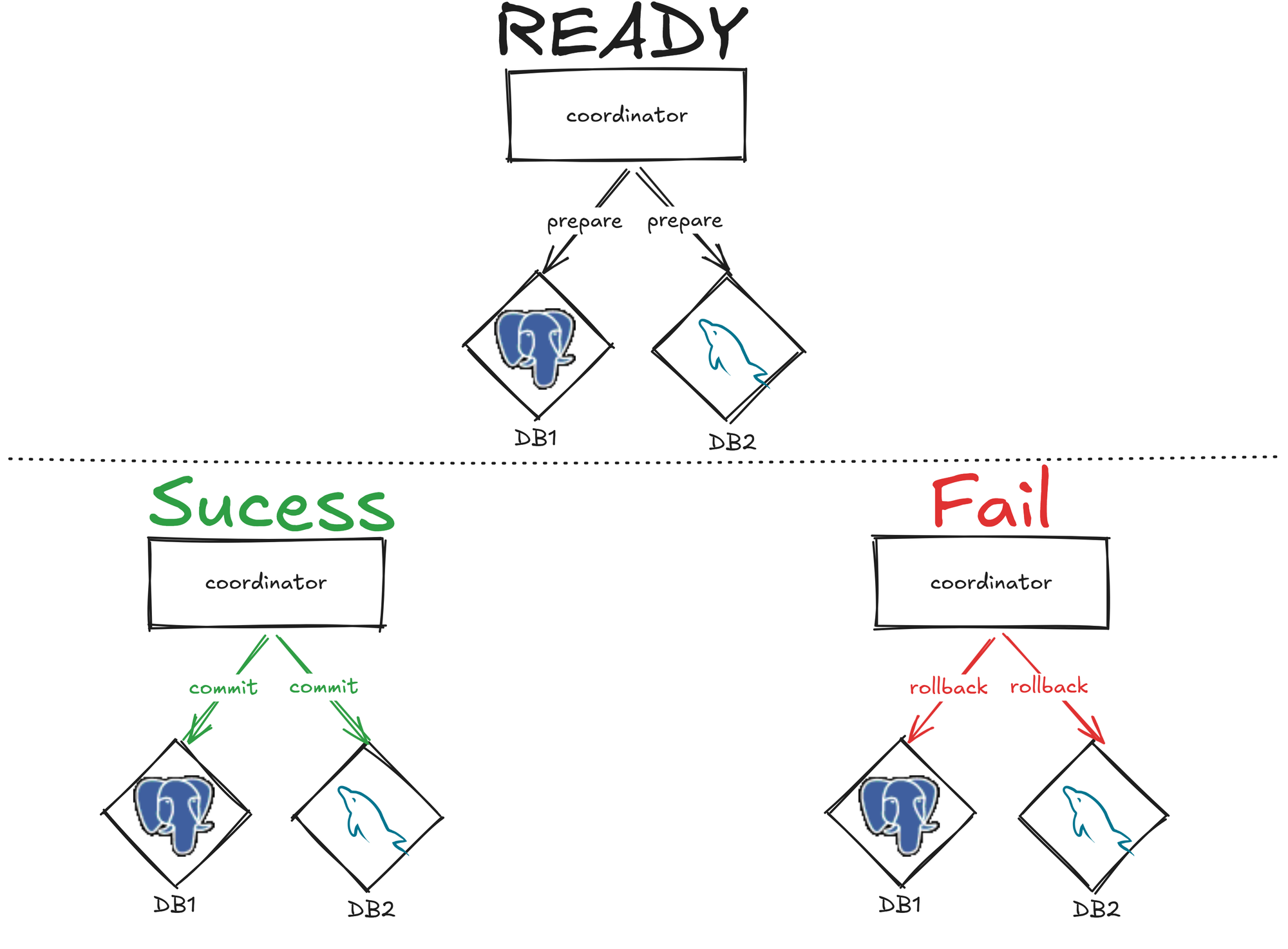 가장 간단하고 직관적이지만, PostgreSQL의 PREPARE TRANSACTION, MySQL의 XA TRANSACTION 처럼 DB 자체가 2PC를 구현해야 하고, DB의 트랜잭션을 오래 잡아두는 방식이라 가용성이 낮아, 실제로는 거의 쓰이지 않아요.