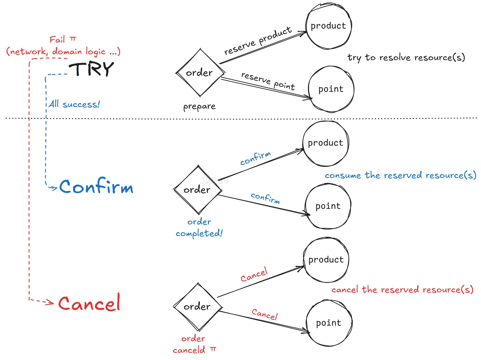TCC는 자원을 먼저 예약(Try) 하고, 그 후 확정(Confirm) 하거나 취소(Cancel)하는 방식이에요.
